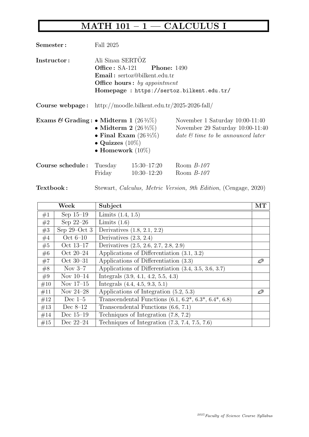 The official webpage for this course is Moodle MATH 101 (All Sections) Calculus I Official announcements will be made through Moodle only |